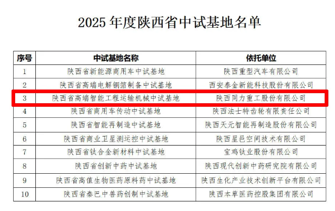 2025年11月,同力重工成功入选“2025年度陕西省中试基地择优支持名单”,获批建设高端智能工程运输机械中试基地,为企业研发成果的高效转化提供有力支撑,进一步强化“专业专注”的研发导向。